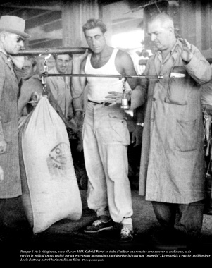 vérifier le poids d’un sac égalisé par un pèse-grains automatique situé derrière lui sous une “mamelle”. Le portefaix à gauche est Monsieur