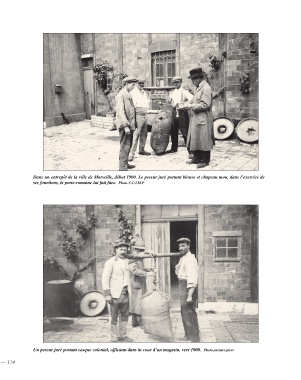 Dans un entrepôt de la ville de Marseille, début 1900. Le peseur juré portant blouse et chapeau mou, dans l’exercice de
